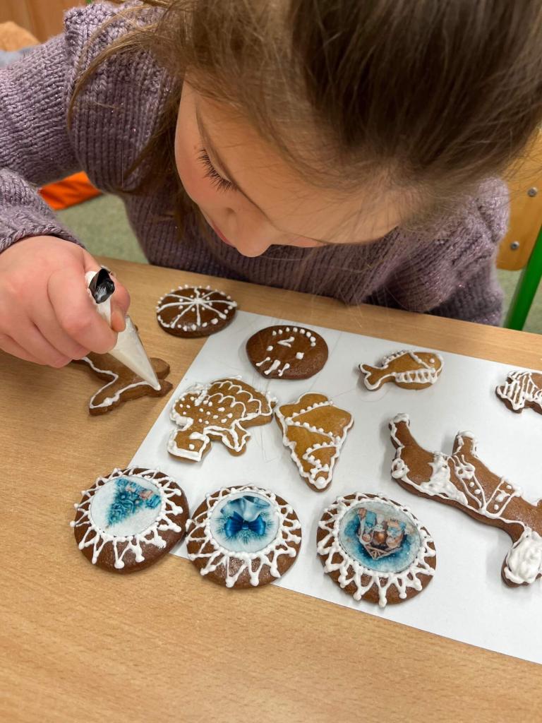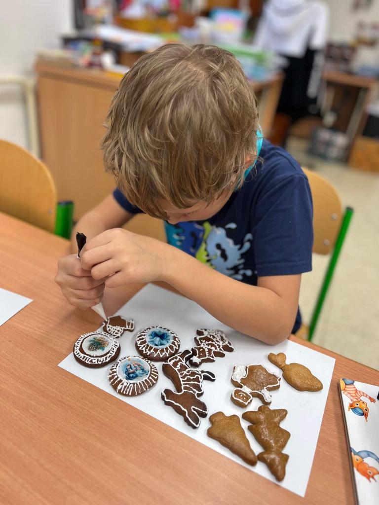 První adventní týden voněl u druháků skořicí a hřebíčkem. Malí cukráři se totiž učili základům pečení i zdobení medových perníčků, které k Vánocům neodmyslitelně patří. S pomocí paní učitelky zvládli podle osvědčeného receptu zpracovat a drobátko i ochutnat perníkové těsto. Válení, vykrajování a pečení jim šlo krásně od ruky a největší radost měli ze závěrečného zdobení sladkou polevou. Hotové perníčky nejen nádherně vypadaly, ale také provoněly celou třídu a navodily tu pravou předvánoční atmosféru.